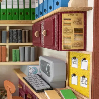 Das lasierte 3D-Wandbild im Format 30 x 22 cm zeigt ein Büro, welches aus natürlichen Holztönen gefertigt wird. Mit der liebevoll gestalteten Einrichtung zeigt dieses Bild detailgetreu alle typischen Gegenstände, die zur Arbeit im Büro oder Sekretariat benötigt werden. Regale, Schreibtische, Drehstühle, Computer, Telefon, Ordner, Schreibtischutensilien usw. - alles findet in diesem Bild seinen Platz.