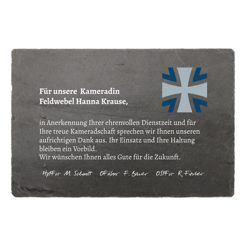 Das Schieferschild gestalten wir nach Ihren Vorgaben mit einem Logo Ihrer Wahl und dem vorgegebenen Wunschtext. Dienstauszeichnungen sind vielfältig gestaltbar. Sie werden für die loyale Treue nach Dienstjahren überreicht. Die bekanntesten Auszeichnungen sind wohl der Verdienstorden oder das Verdienstkreuz. Das Schild kann begleitend zu einer hohen Auszeichnung mit einer individuellen Widmung gestalten werden. Es gibt aber auch eine Vielzahl an Anlässen (z.b. Feuerwehr, Vereine, Polizei, Bundeswehr, Firmen usw.), für die eine dekorativ gestaltete Schieferplatte als Auszeichnung überreicht werden kann.