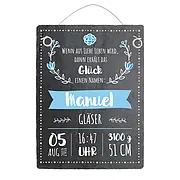 Ob als Geschenk für die Eltern, für Freunde, Angehörige oder auch zur eigenen Erinnerung, bekommen Sie mit diesem Schild ein wunderschönes Andenken an die Geburt des Babys. Der Name, das Datum, die Uhrzeit, das Gewicht und die Größe des Jungen werden als Daten verwendet. Die Farbtöne sind für Jungs ausgewählt und unterstreichen das verspielte Design.