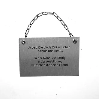 Optional liefern wir das Schraubenmännchen mit einem angehängten Schild, auf dem Ihr Wunschtext gedruckt wird. An dieses Aluminiumschild bringen wir mit zwei Schrauben eine Kette an, womit es an das Schraubenmännchen gehängt werden kann. Wir beschriften dieses Schild mit einem Geburtstagsgruß, einem Glückwunschtext zur bestandenen Prüfung, einem Gratulationstext zur Hochzeit, mit Worten der Auszeichnung zum Jubiläum und zur Pensionierung oder mit jedem anderen Spruch Ihrer Wahl.
