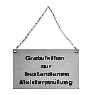 Metallschild mit Beispiel Text "Gratulation zur bestandenen Meisterprüfung"