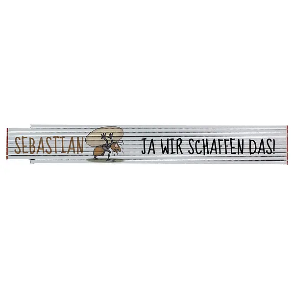 Geschenkidee für Handwerker - Zollstock mit Name und Spruch "Wir schaffen das!" Wir drucken den Spruch und die angestrengt schleppende Ameise auf einen Zollstock, optional können Sie einen Namen angeben, den wir in hellbraun drucken.